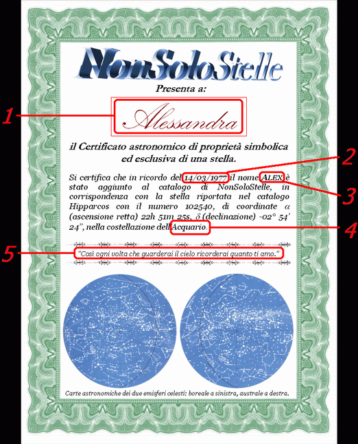 Regalare una stella è il regalo che dura per sempre! In questo sito scoprirai come regalare una stella da online star register (osr.org), il sito affidabile e ufficiale per regalare stelle. Regalare una stella è il regalo che dura per sempre! Nemmeno il sito ufficiale della nasa ha il diritto e la possibilità di comprare o possedere una vera stella del cielo. Comprare una stella non potrà mai deludere, grazie alle stampe altamente professionali dei documenti e delle certificazioni relative a ciascuna stella... Atto di registrazione del nome della stella in formato a4.